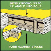 Knockouts are provided at 6” centers along the joint for dowels or rebar penetration. The knockouts should be bent to approximately 45 degrees into the pour to act as anchors, especially when Key-Loc ® is used as a shut-off. Install stake clip when it is necessary to pour on the stake side first. |